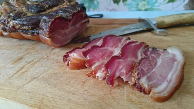 Κατά τη διαδικασία μαγειρέματος, θα πρέπει περιοδικά να ανοίγετε τη συσκευή και να αντικαθιστάτε άνθρακα και τσιπ. Είναι επίσης σημαντικό να παρατηρήσετε το καθεστώς θερμοκρασίας του ψυχρού καπνίσματος στο καπνό, έτσι ώστε η θερμότητα να μην αυξάνεται περισσότερο από 40 βαθμούς. Η τελική λιχουδιά αερίζεται στον καθαρό αέρα για 1-2 ημέρες. Το χοιρινό σερβίρεται κρύο στο τραπέζι ως ορεκτικό για τα κύρια πιάτα.