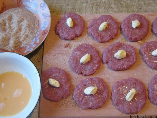 - Χωρίστε τον ψυχρό κιμά σε ίσα μέρη. Ξεδιπλώστε μικρά κέικ από αυτά.