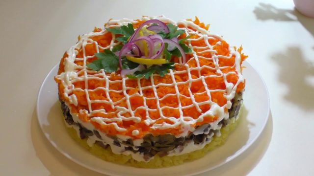 - 2 Κλασική συνταγή για σαλάτα με γούνα Fox με μανιτάρια και ρέγγα