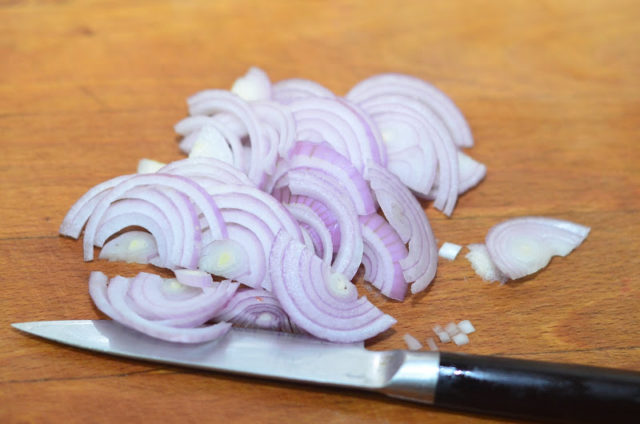 - Κόψτε την κεφαλή του κρεμμυδιού σε λεπτούς μισούς δακτυλίους.