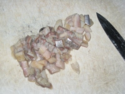 - Κόψτε το φιλέτο ρέγγας σε μικρούς κύβους. Τοποθετήστε τα σε στρώσεις σε ένα μπολ σαλάτας ή σε μια μεγάλη επίπεδη πλάκα.