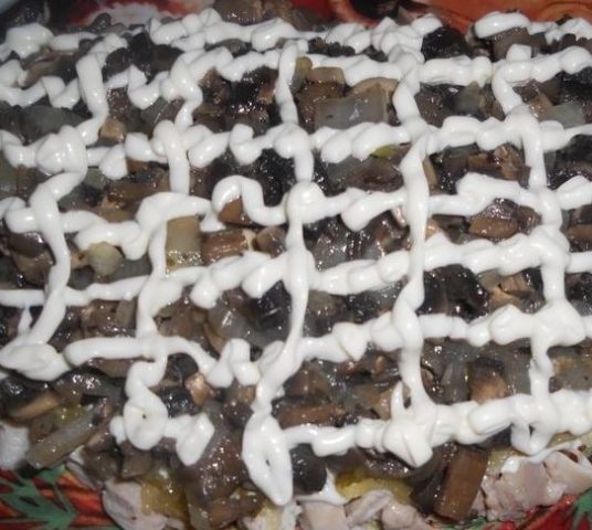 - Τοποθετήστε τα στρώματα με την ακόλουθη σειρά: στήθος κοτόπουλου, κρεμμύδι, μαγιονέζα ματιών, αυγά, μαγιονέζα ματιών, καρότα.