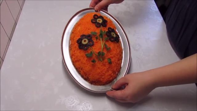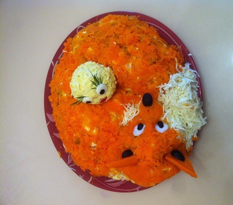 - Πασπαλίστε το στρώμα του μανιταριού με τριμμένα καρότα. Με τη βοήθεια ψιλοκομμένων αυγών, "τραβήξτε" την ουρά ή το ρύγχος του chanterelle. Τα μάτια μπορούν να φτιαχτούν από μισά ελιές.