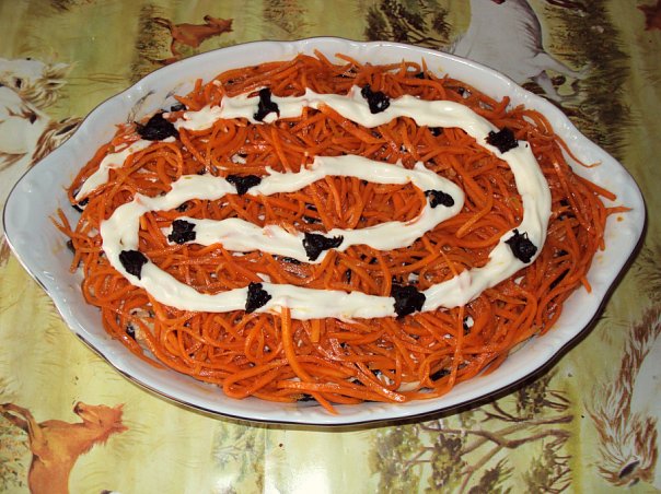 Τα καρότα σε αυτή τη σαλάτα δεν βράζονται, χρησιμοποιούνται ωμά. Αλλά για να είναι αρμονική η γεύση, η ρίζα πρέπει να τρίβεται σε λεπτό τρίφτη.