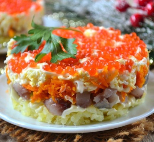 Το ανώτερο στρώμα στη σαλάτα σολομού μπορεί να είναι κόκκινο χαβιάρι