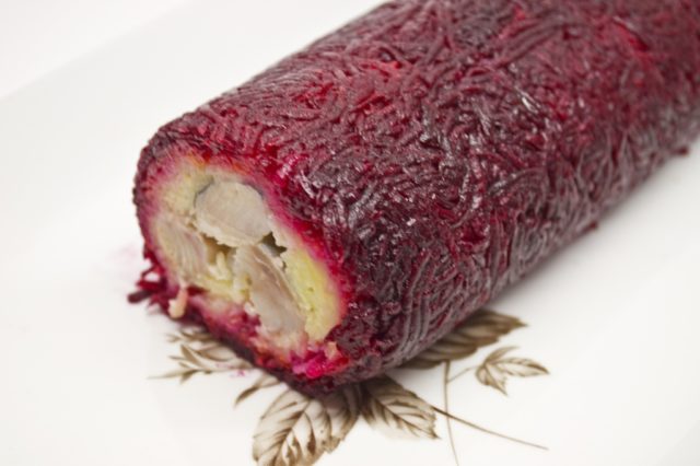 - Τυλίξτε απαλά το ρολό έτσι ώστε τα στρώματα των παντζαριών να επικαλύπτονται. Σφραγίστε τις άκρες, τυλίξτε ξανά με μεμβράνη προσκόλλησης.