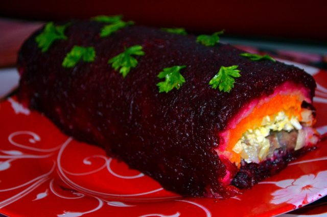- Διπλώστε το στρώμα καρότου-παντζαριού στο φύλλο. Περιχύνουμε με σάλτσα μαγιονέζας.