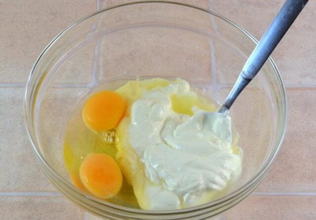 - Ρίξτε το βούτυρο, την ξινή κρέμα σε ένα βαθύ δοχείο, σπάστε τα αυγά, ανακινήστε ελαφρά.