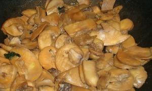 - Τηγανίζουμε τα ψιλοκομμένα κρεμμύδια σε λίγο λάδι μέχρι να ροδίσουν. Προσθέστε τα μανιτάρια στο ίδιο τηγάνι, τηγανίστε μέχρι να μαλακώσουν. Τοποθετήστε σε μια χαρτοπετσέτα για να αποστραγγίσετε το υπερβολικό λάδι.