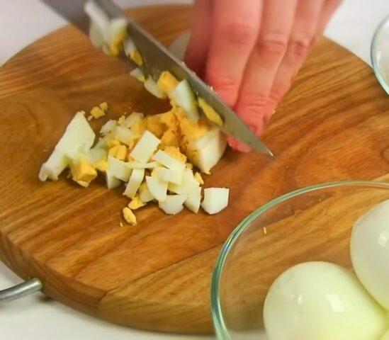- Βράζουμε τα βραστά αυγά, τα ψιλοκόβουμε ή πουρέ με ένα πιρούνι.