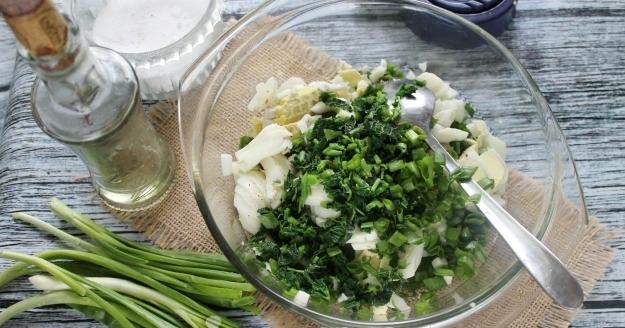 - Ανακατέψτε τα αυγά και τα βότανα, προσθέστε αλάτι και φυτικό λάδι, ανακατέψτε καλά.