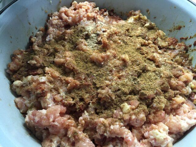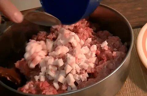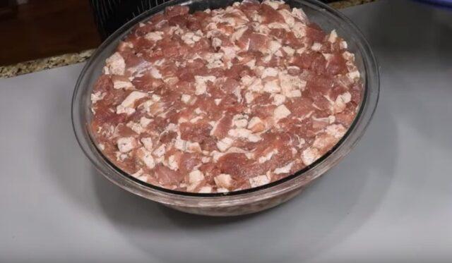 - Κρατήστε το κομμένο μπέικον και το στήθος για μερικές ώρες στον καταψύκτη, κόψτε σε μικρούς κύβους, ανακατέψτε με κιμά.