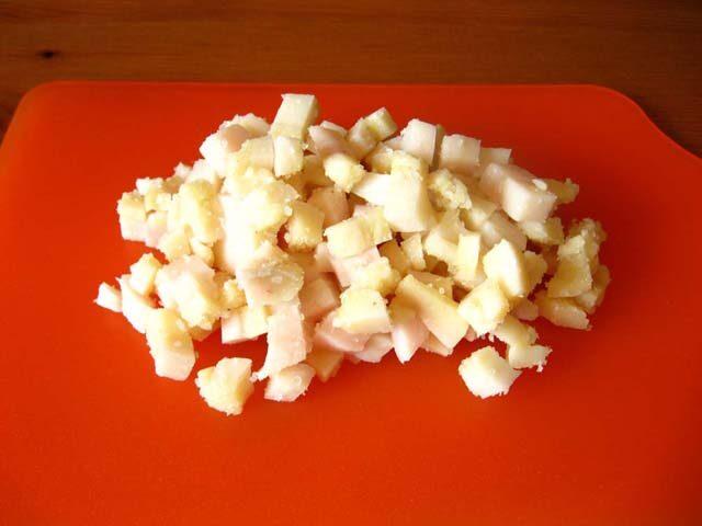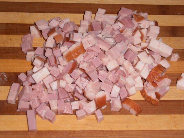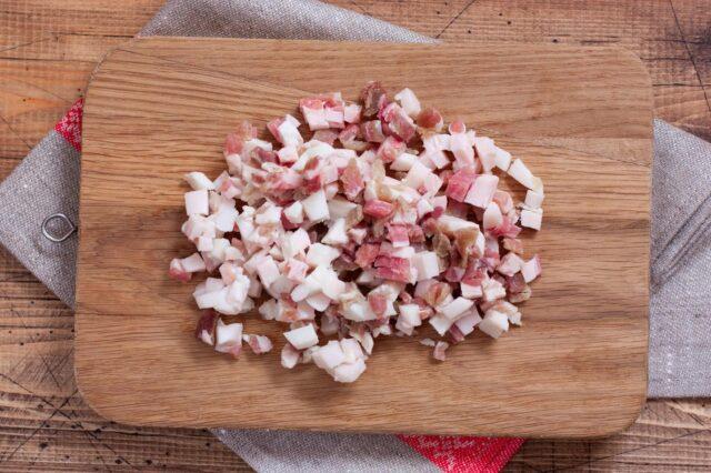- Καταψύξτε μπέικον και μπέικον στον καταψύκτη, κομμένα σε κύβους 5-6 mm.