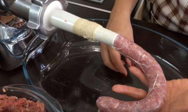 - δένοντας τα ψωμιά του λουκάνικου, πρέπει να τα σφίξετε όσο το δυνατόν πιο σφιχτά. Αυτό θα βοηθήσει να συμπιέσετε τον κιμά στο περίβλημα όσο το δυνατόν περισσότερο.