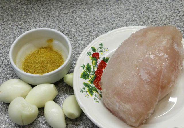 Θα χρειαστείτε 500 g στήθους, 6-8 τεμ. καρύδια, 2 σκελίδες σκόρδο, μπαχαρικά για γεύση.
