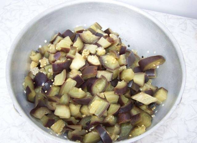 - Οι μελιτζάνες τοποθετούνται σε σουρωτήρι και στη συνέχεια αποστέλλονται σε βραστό νερό για ακριβώς 1 λεπτό.